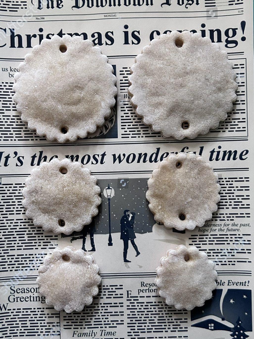 I had some leftover dough this year, so I used some scalloped round cookie cutters and straws to make the shapes above. Odd thing though, they puffed up while baking! So, I am not sure I’ll use them as I intended. If I do… I will post the updates here.