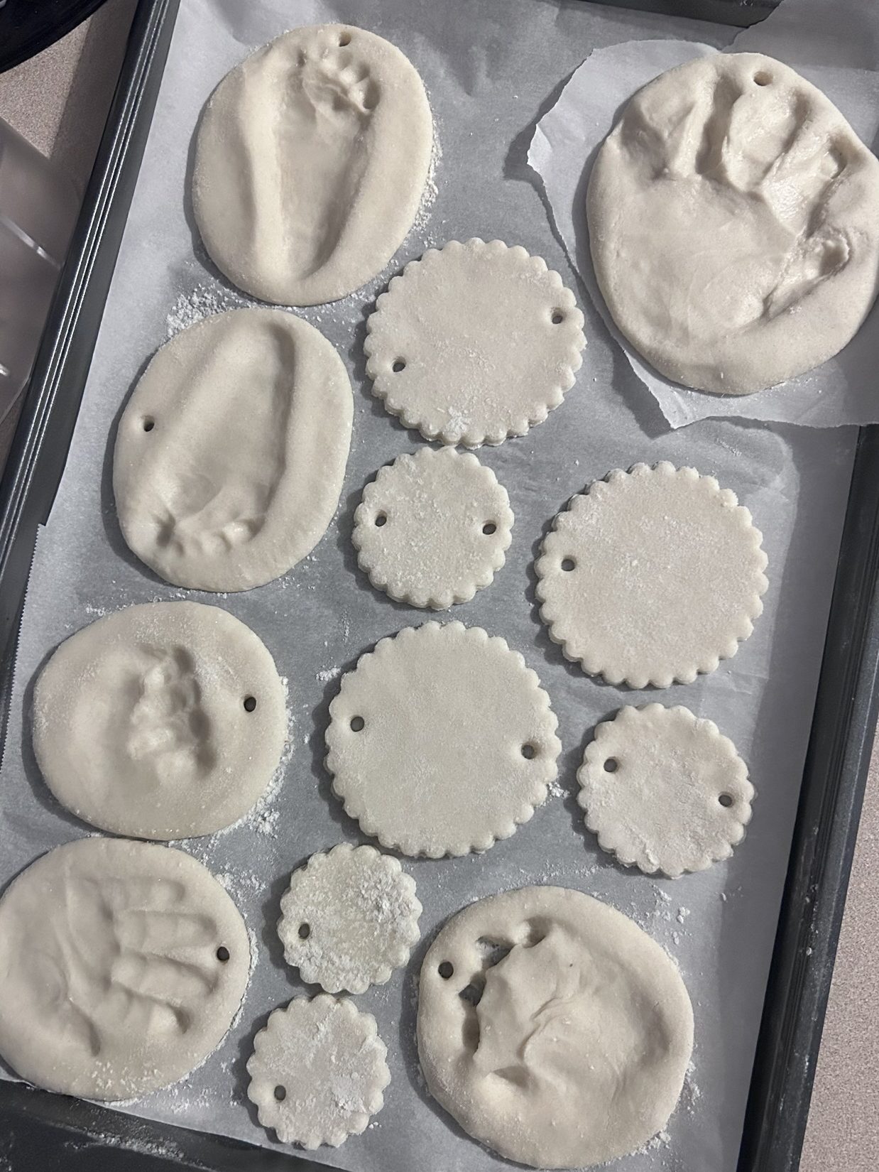 - Bake your dough shapes for 3 hours at 200 degrees Fahrenheit. Remove from oven, and let cool.